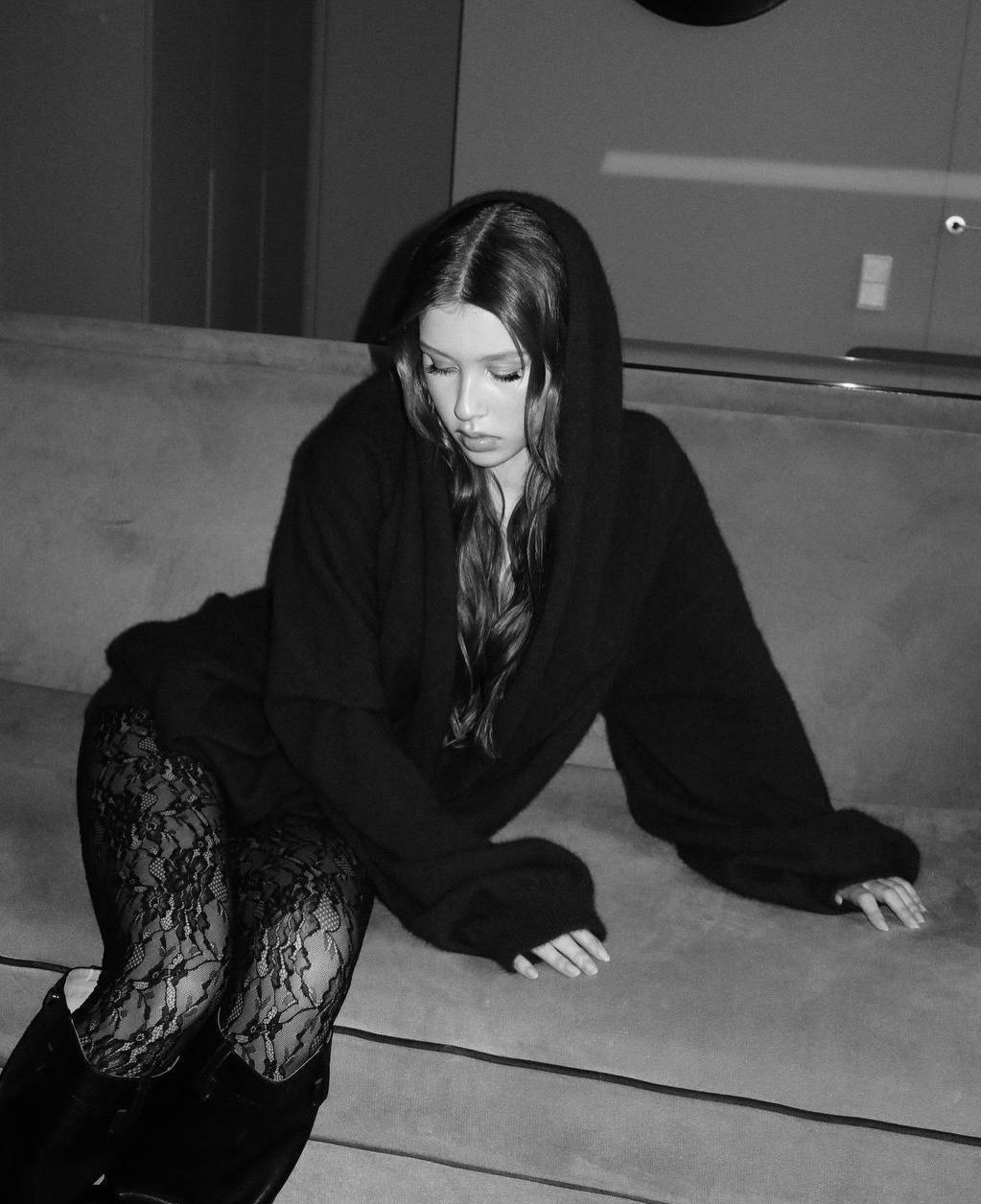 Анна, дочь известной актрисы Юлии Пересильд, предстала перед камерой в бордовом костюме с капюшоном, дополнив его однотонным коротким топом. Образ завершили чёрные кружевные колготки.