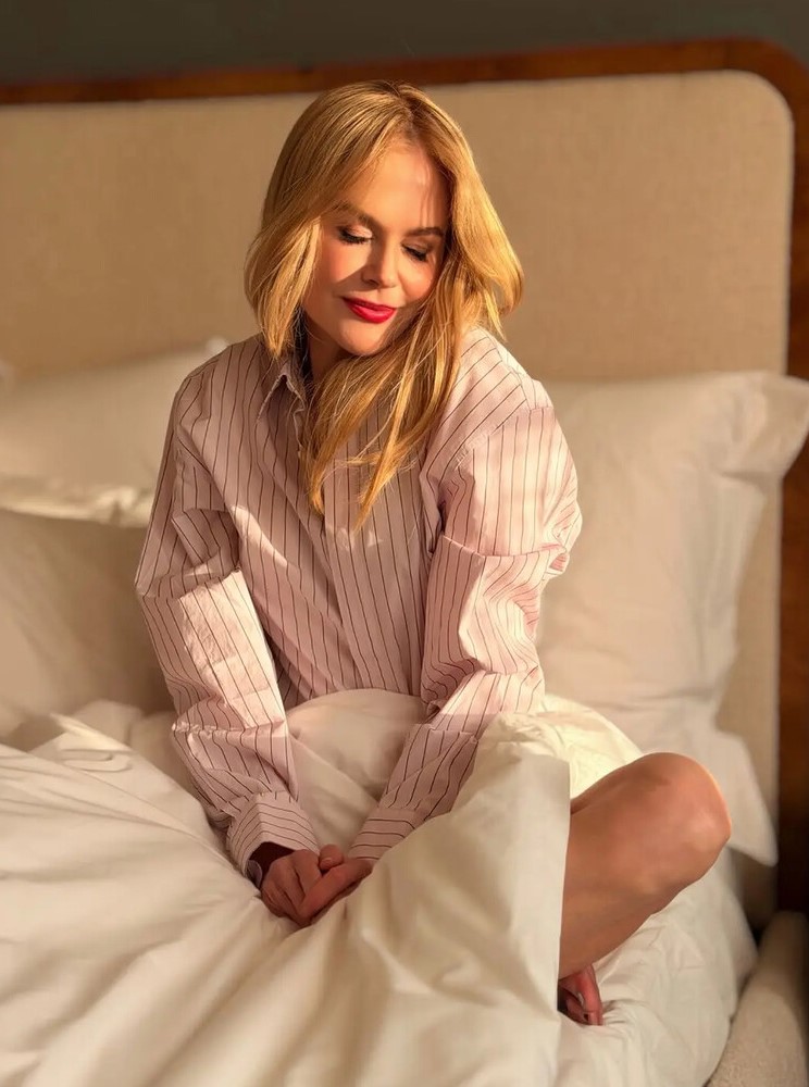 58-летняя Николь Кидман позировала в розово-белой рубашке в тонкую полоску. Актриса предстала перед камерой с уложенными распущенными волосами и макияжем с черными стрелками и розовой помадой. Знаменитость сидела на кровати в спальне. Под фото она поздравила подписчиц с Днем подруг.
