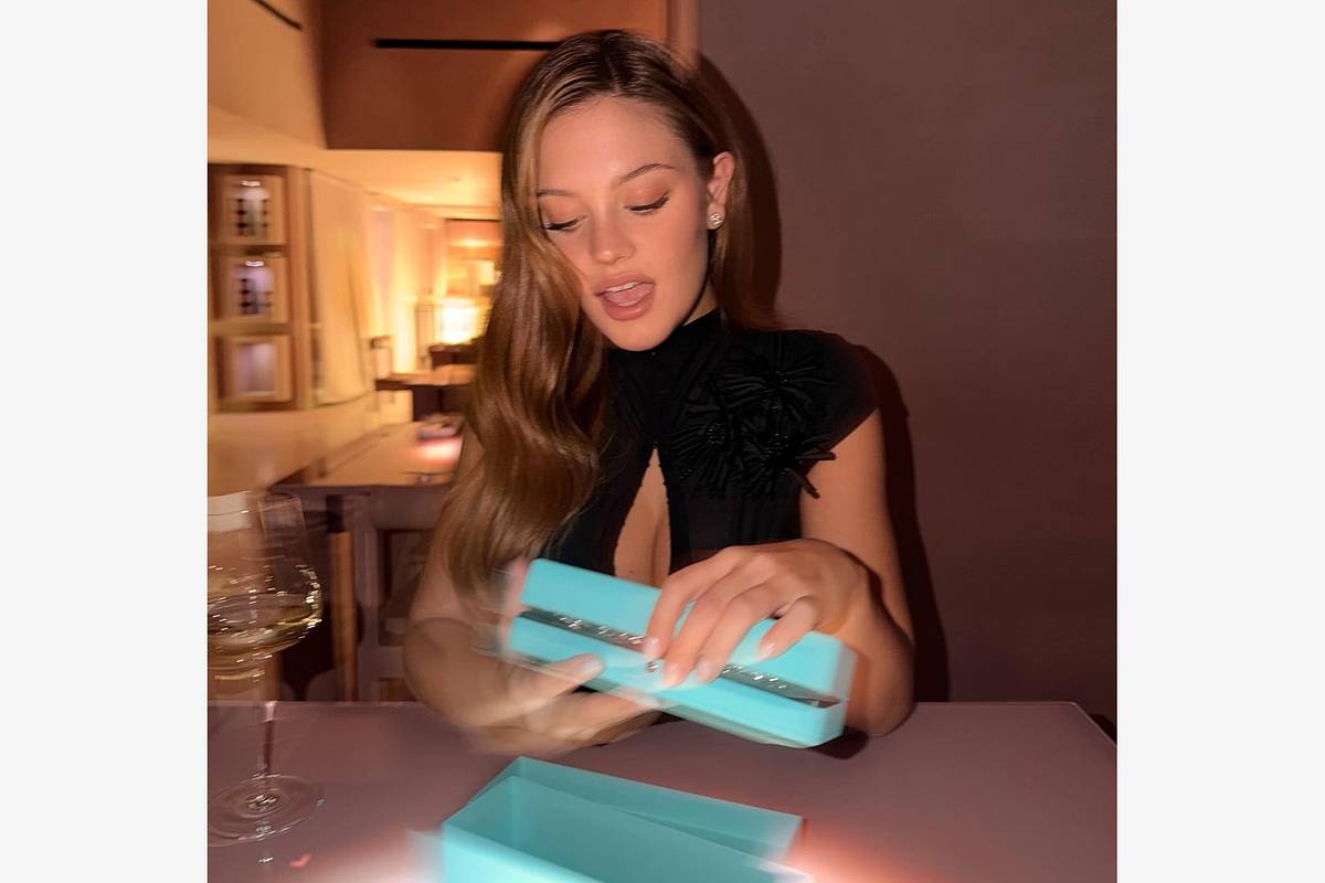 25-летняя блогерша и предпринимательница предстала на размещенных кадрах в полупрозрачном черном наряде, оформленном вырезом на груди. Перед ней лежала коробка, в которой находились часы люксового бренда Tiffany & Co. Известно, что стоимость модели составляет 7,6 тысячи долларов (около 580 тысяч рублей).