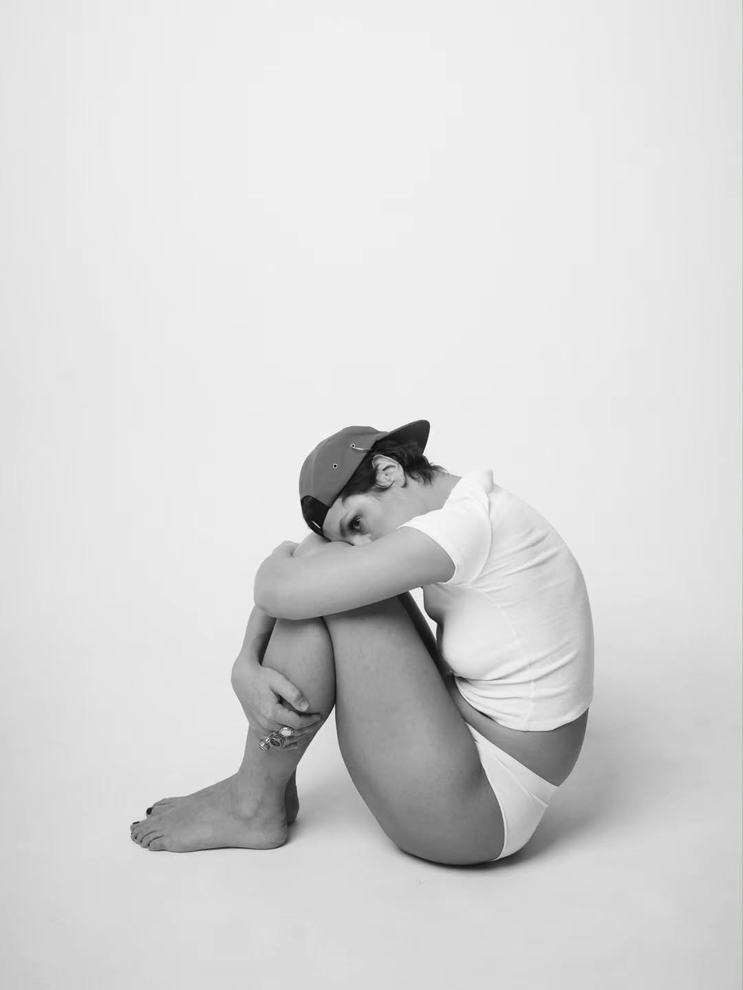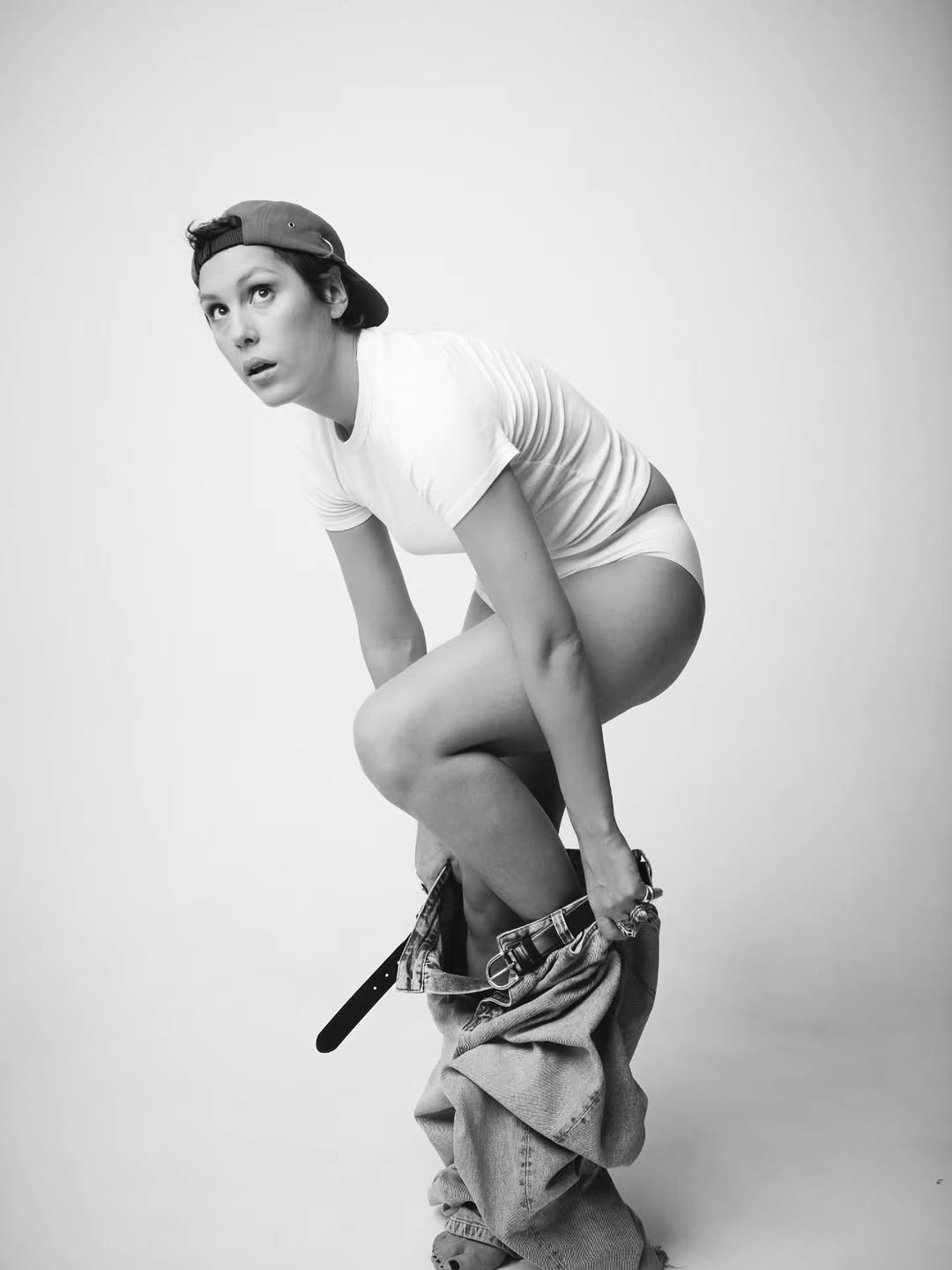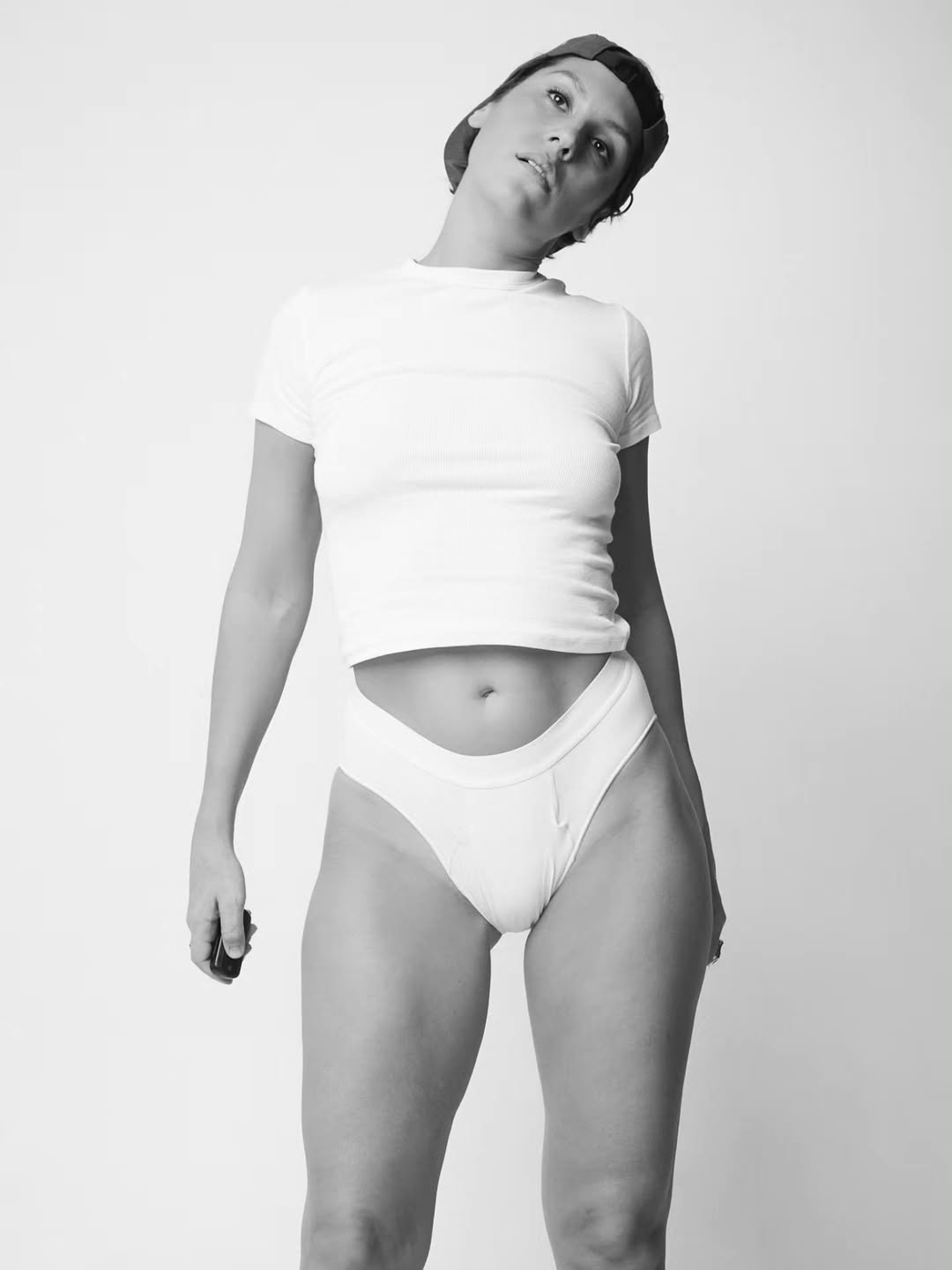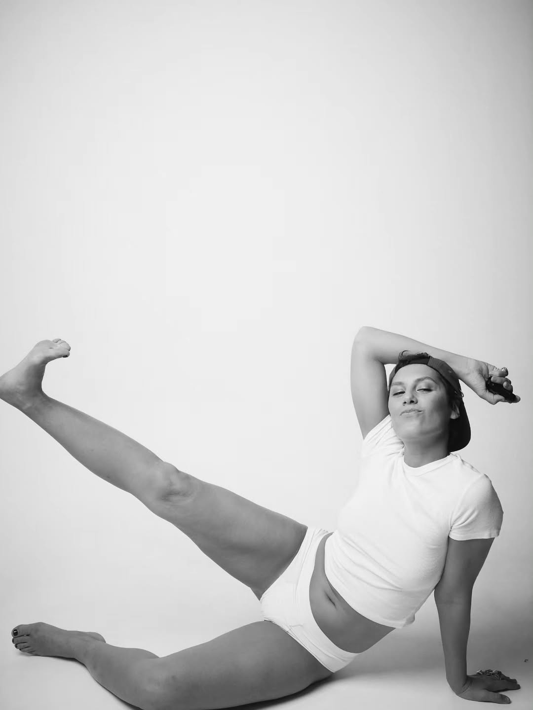 На фото она не позирует кокетливо — стоит, сидит, поднимает ногу, проверяя тело «на реальность». Взгляд прямой, без вызова.