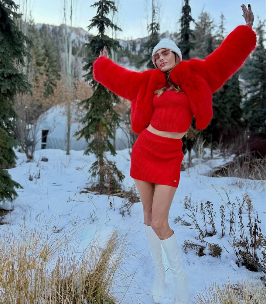 Алессандра Амбросио предстала перед камерой в красном топе, который дополнила трикотажной мини-юбкой в тон и укороченной шубой. Модель добавила к образу белую шапку, очки и высокие кожаные сапоги на каблуках. Манекенщица позировала с распущенными волосами и макияжем в нюдовых тонах в заснеженном лесу.