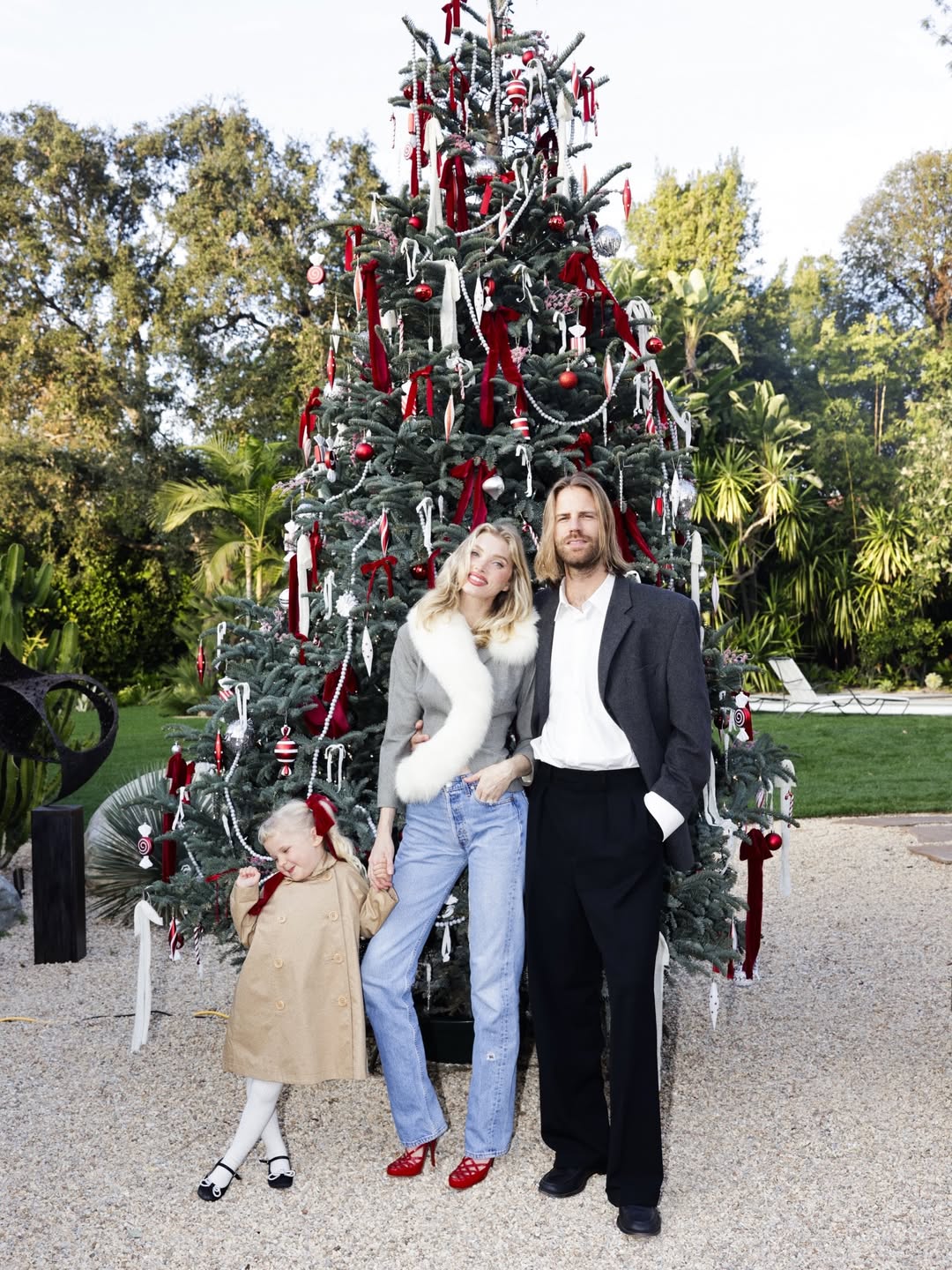 Эльза Хоск снялась с мужем и дочерью у новогодней елки. Модель позировала в джинсах, серой шубе с белым мехом и красными босоножками. Образ дополнили черные очки. Елку семья установила елку в саду загородного дома.