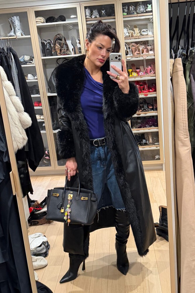 Эшли Грэм позировала в синих рваных джинсах, синем топе на одно плечо, черном пальто с меховой отделкой. Образ дополнили сапоги на низких каблуках и сумка Birkin от Hermes, стоимость которой составляет от 2 миллионов рублей в официальном бутике. Волосы модель уложила в низкий пучок и сделала легкий макияж.