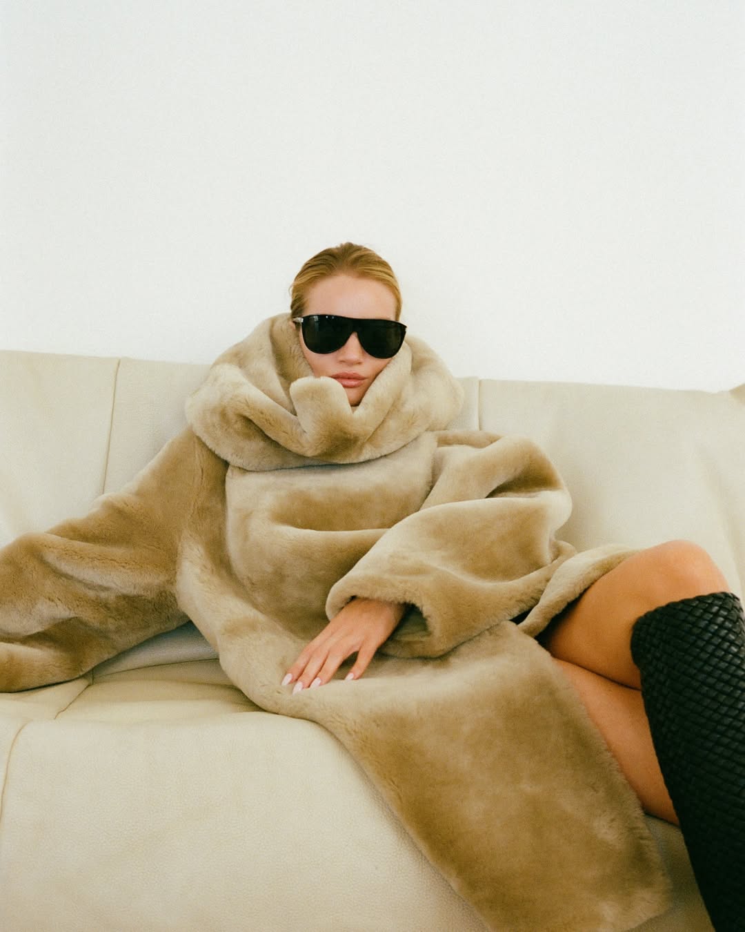 Модель Рози Хантингтон-Уайтли снялась в бежевой шубе на голое тело. Образ дополнили очки и сапоги из плетенной кожи. Волосы ей собрали в пучок и сделали легкий макияж.