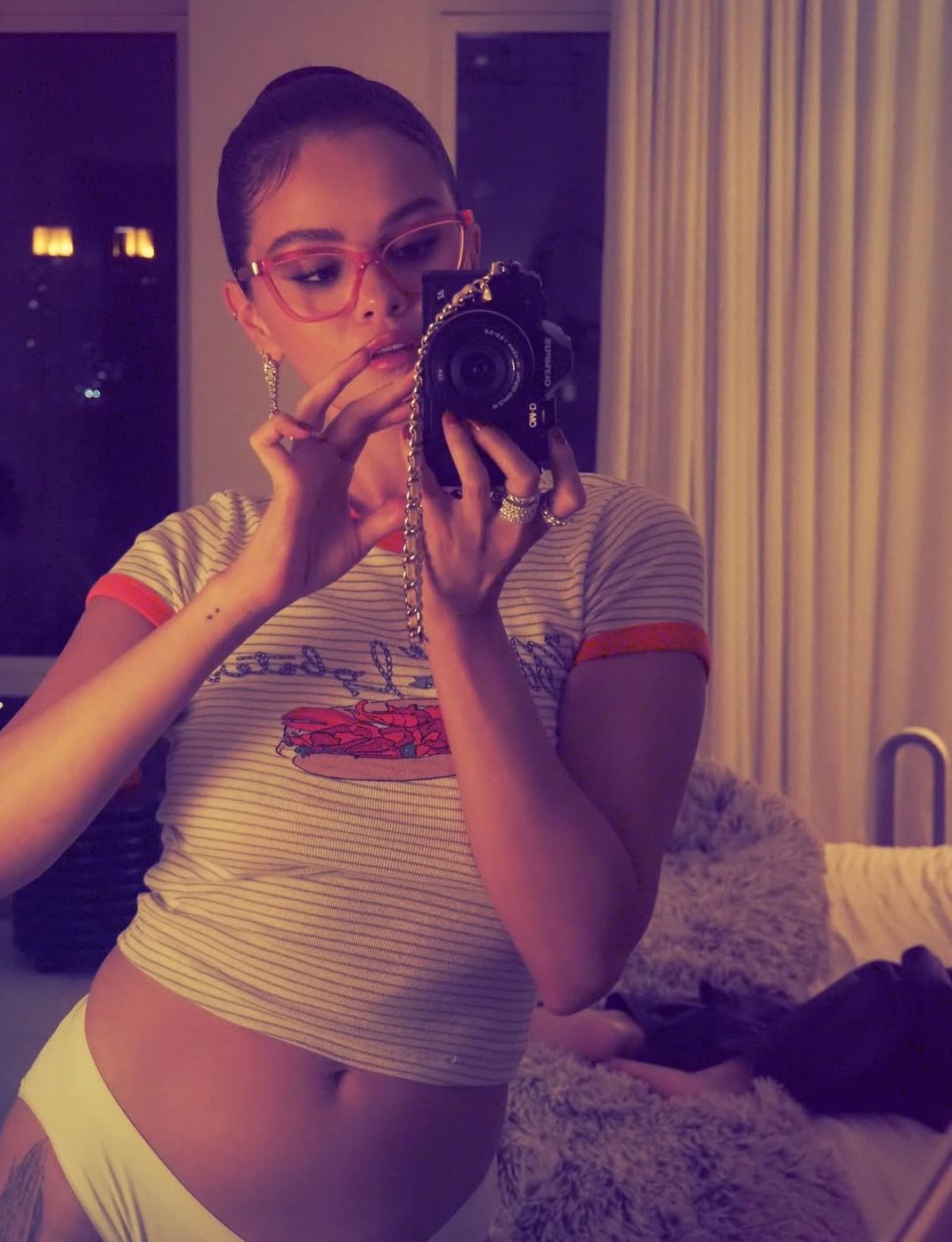 33-летняя Селена Гомес стояла перед зеркалом в полосатой футболке и белых трусах. Певица также надела очки для зрения в красной оправе, длинные серьги и множество колец. Поп-исполнительница собрала волосы в гладкий пучок и сделала макияж с черными стрелками и блеском для губ.