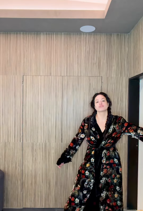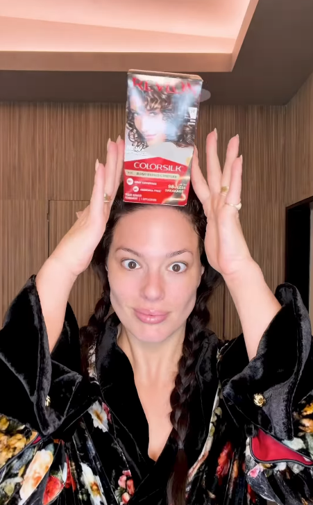 Эшли Грэм была одета в черный халат с цветочным принтом. При этом модель позировала без макияжа и укладки. Перед камерой она показала утреннюю рутину и как делает нюдовый макияж перед зеркалом.