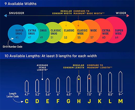 Еще один бренд продвигает презервативы в рамках кампании «идеальная посадка». В ассортименте более 60 размеров, у каждого из которых своя длина (от 10 до более чем 23 сантиметров) и обхват (от 10 до 16 сантиметров). Дело в том, что, как утверждает генеральный директор компании Дэвин Ведель, нынешние модели, которые имеются в продаже, идеально подходят лишь 12 процентам мужчин.