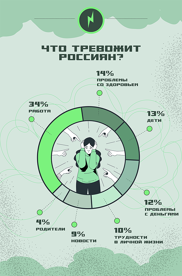 Чтобы избавиться от тревоги, специалисты рекомендуют подобрать вид активности по душе — ею может стать плавание, бег, велосипед, йога или хотя бы энергичная ходьба — и стараться заниматься минимум три раза в неделю по полчаса. В среднем у людей, которые внедряют спорт в свою жизнь на регулярной основе, симптомы тревоги снижаются на 42-60 процентов (для сравнения, от психотерапии и медикаментов — примерно на 30-40 процентов).